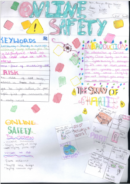 Shanaya Gambhir [7Y]: We made posters based on online safety to make others aware of the dangers that social media can pose. We learnt about keeping all social media accounts private, not sharing personal information with other (addresses, full names, bank details) as well as what to do if you feel unsafe online. We were able to understand the risks through "what would you do" scenarios.